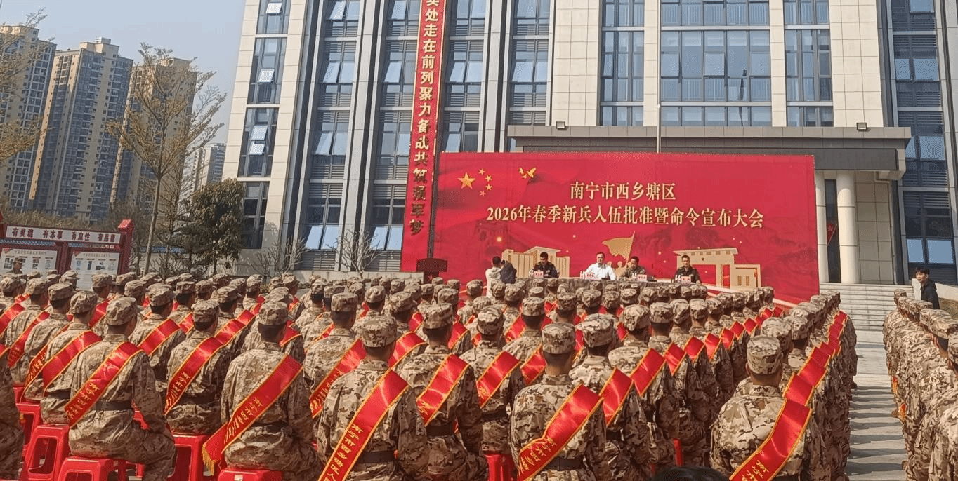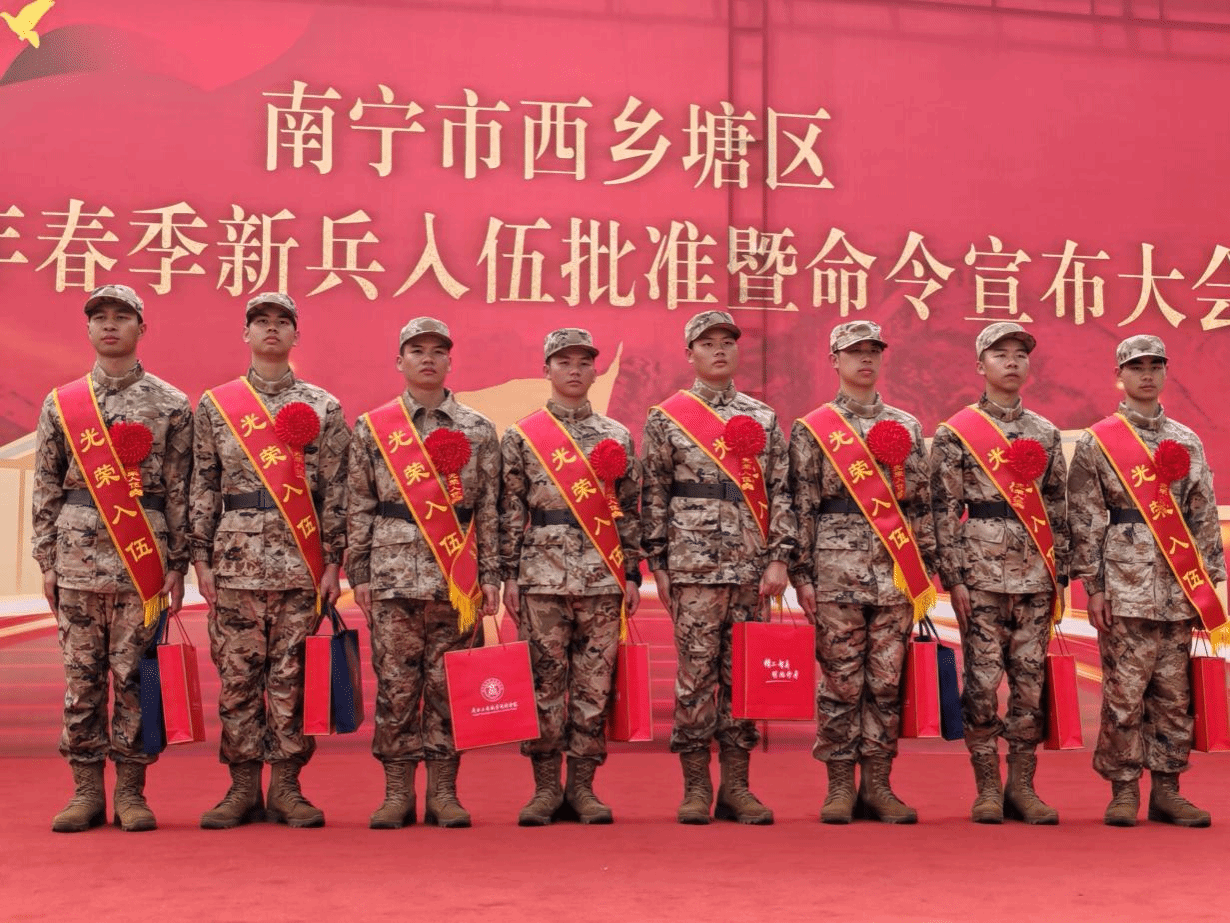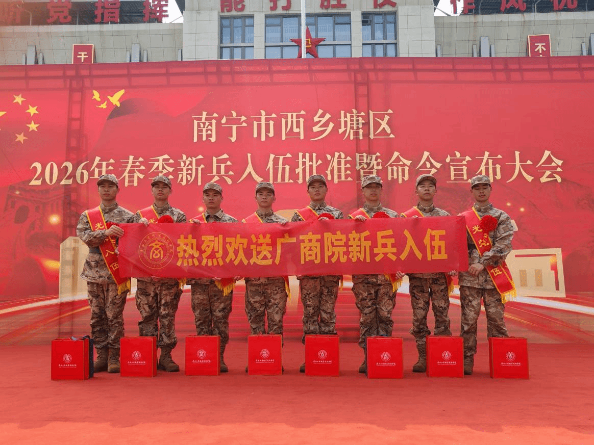 三月春风暖,学子戍国情。3月13日上午,南宁市西乡塘区隆重举行2026年春季新兵入伍欢送大会,为即将奔赴军营的新兵送行。其中,我校有8名学子精神昂扬、意气风发地在队伍当中,展现出新时代广商院学子心系家国、勇担使命的青春风采,他们是广商院的好儿郎。