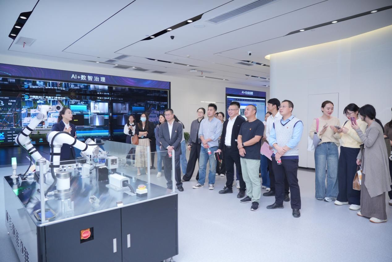在数智AI体验展厅,支部党员依次参观了智慧城市、智慧校园、人工智能等展区,近距离观摩了机械臂名片打印、VR党建、VR沉浸式体验系统、AI拍报机、陈刚书记同款AI智能题词翻译眼镜等前沿技术展示,亲身体验了多项令人瞩目的数字技术应用。中国移动广西公司讲解员详细讲解了各项技术在智慧校园建设、教育信息化等领域的实际应用案例,让同志们切身感受到人工智能技术在日常生活工作和党建活动中的广阔应用前景。