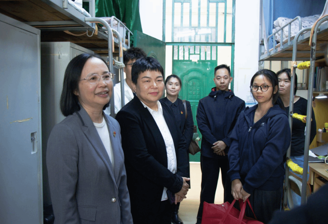 为全面落实立德树人根本任务,扎实推进领导干部深入基层联系学生工作,2025年11月26日下午,学校党委副书记、纪委书记韦云凤来到中尧校区,通过讲授思政课与走访学生宿舍相结合的方式,深入“一站式”学生社区,与同学们进行了面对面的交流与慰问。党委学生工作部、会计学院相关负责人一同参加活动。