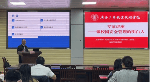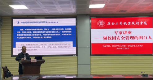 为全面提升校园安全管理水平,增强广大师生员工的安全防范意识与应急处理能力,筑牢校园安全防线,学院学生工作处于2025年12月9日在广西工商职业技术学院鹏飞校区成功举办了题为“做校园安全管理的明白人”的专题安全教育讲座。讲座特邀自治区教育厅安稳处一级调研员熊忠良担任主讲,学校相关部门负责人、各二级学院辅导员、学生骨干及后勤安保人员代表等到场聆听学习。