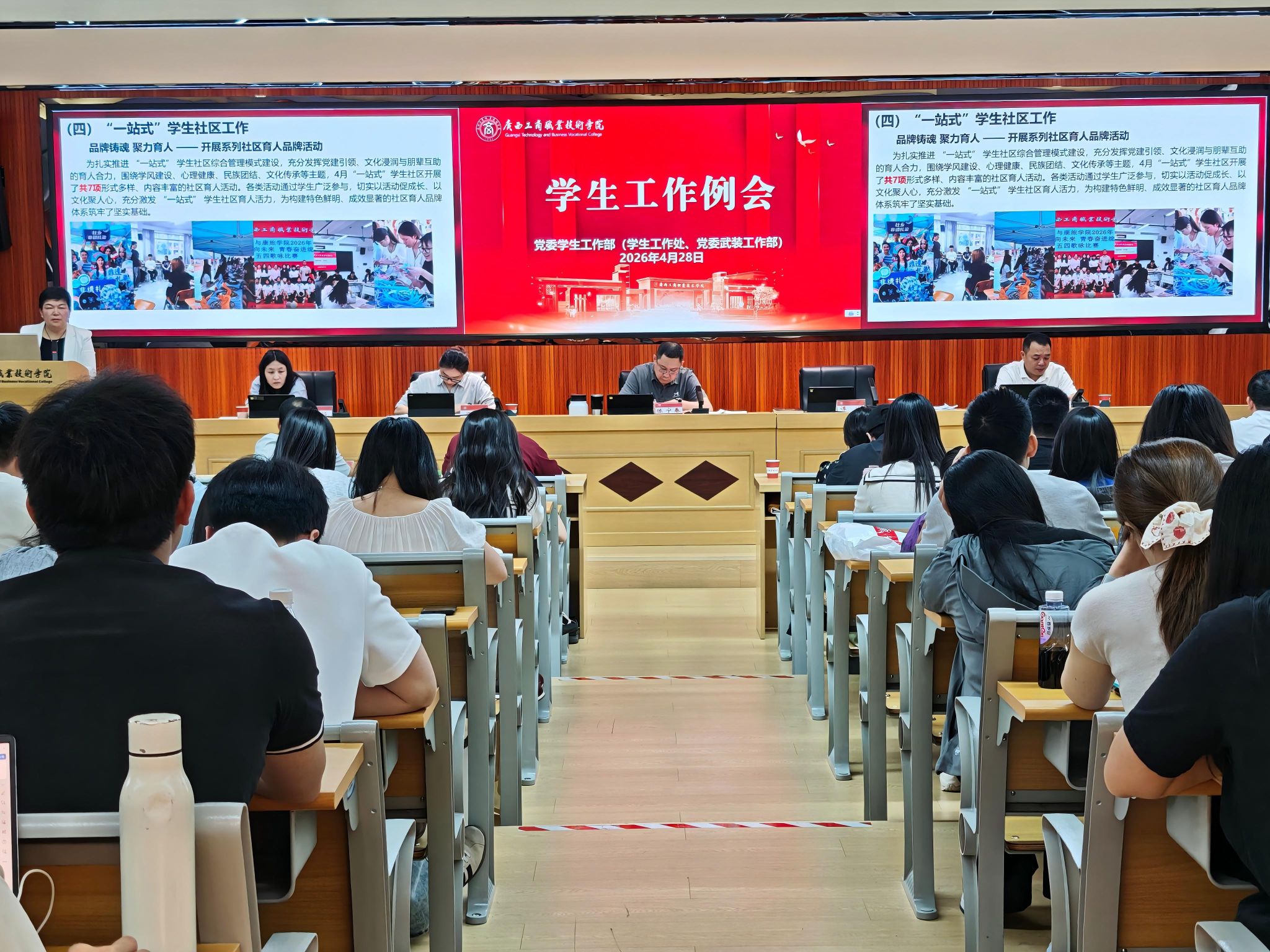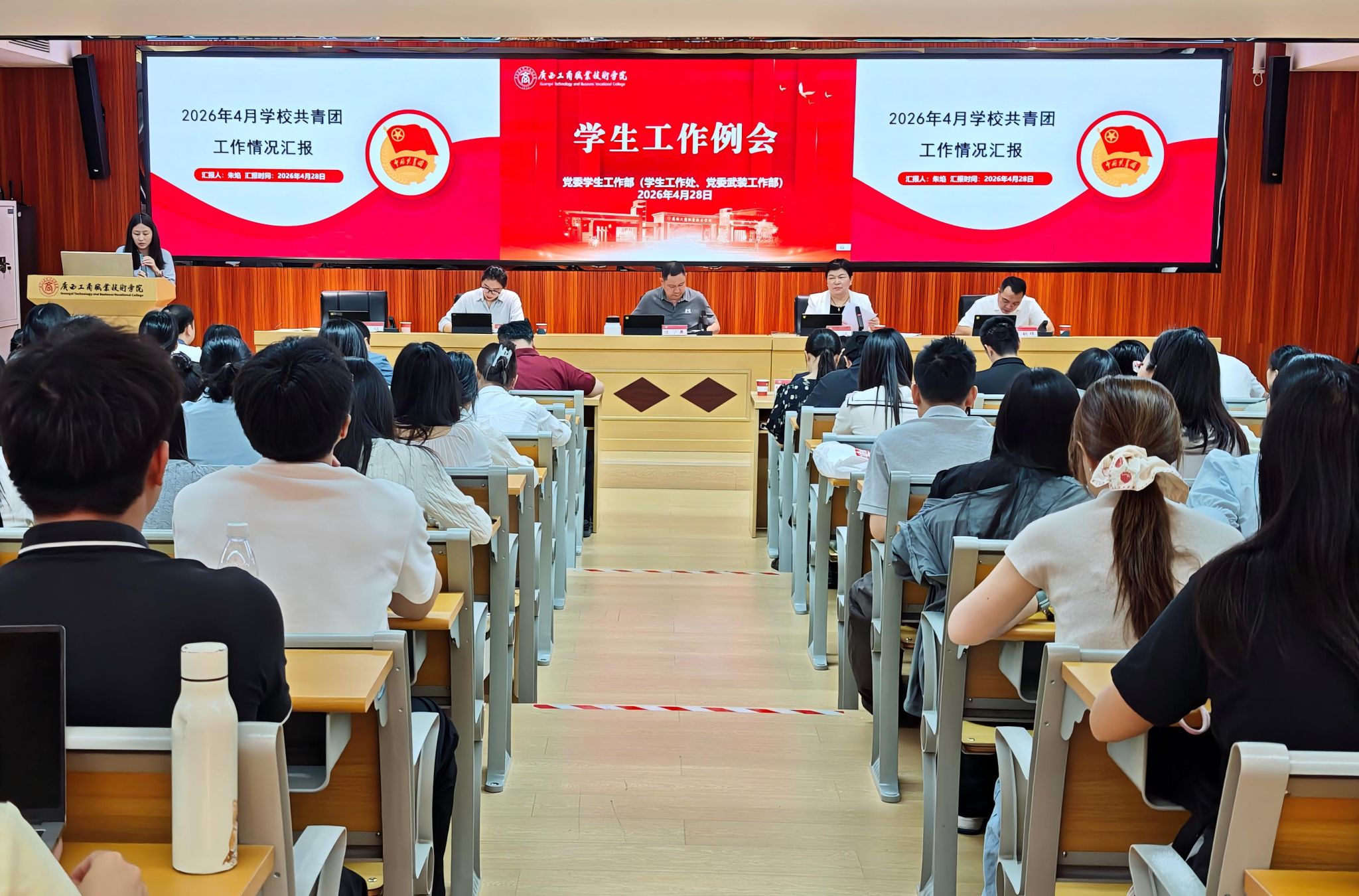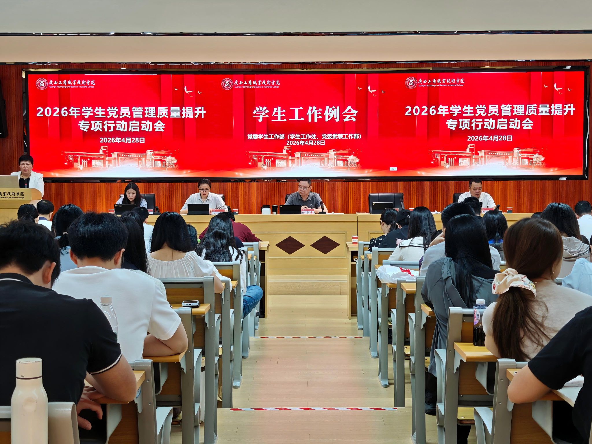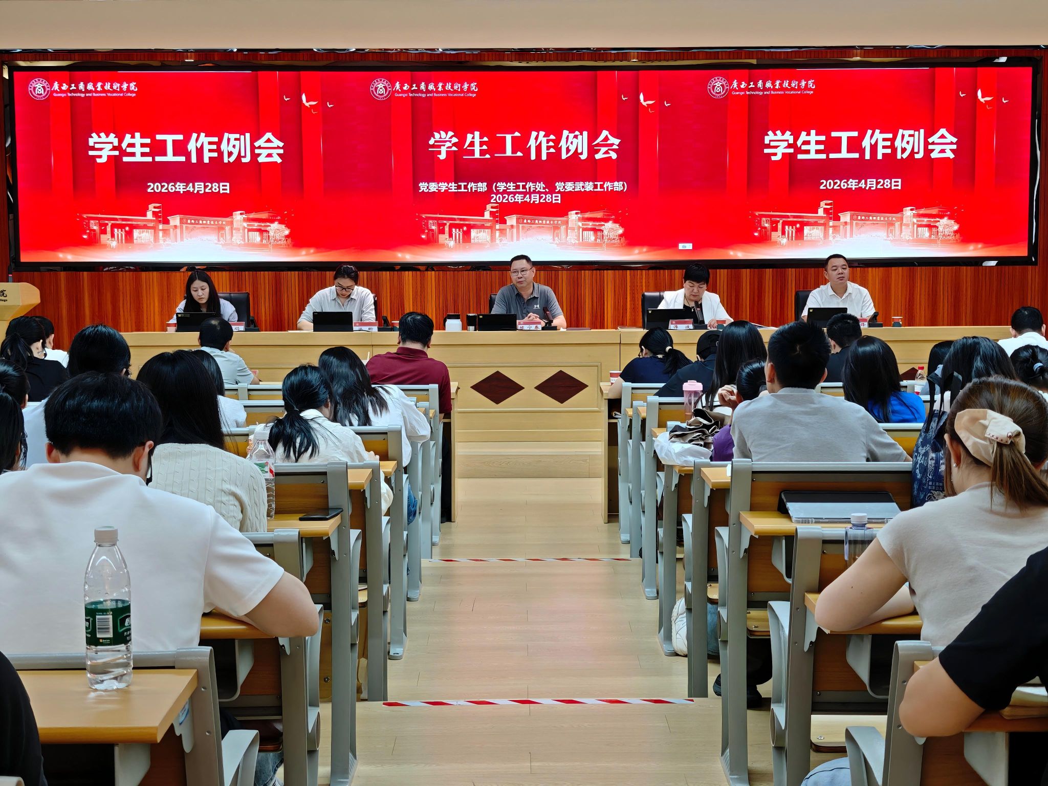 为全面梳理近期学生工作成效,精准部署下一阶段重点任务,持续推动学校学生工作高质量发展,2026年4月28日上午,学校2026年4月学生工作例会在鹏飞校区2145会议室顺利召开。学校副校长陈宁春出席会议并讲话,党委学生工作部(学生工作处、党委武装工作部)、心理健康教育与咨询中心、学校团委全体人员,各二级学院党总支书记、学工副院长、学生科及团委工作负责人,全体专、兼职辅导员参加会议。会议由党委学生工作部(学生工作处、党委武装工作部)部(处)长谭波主持。