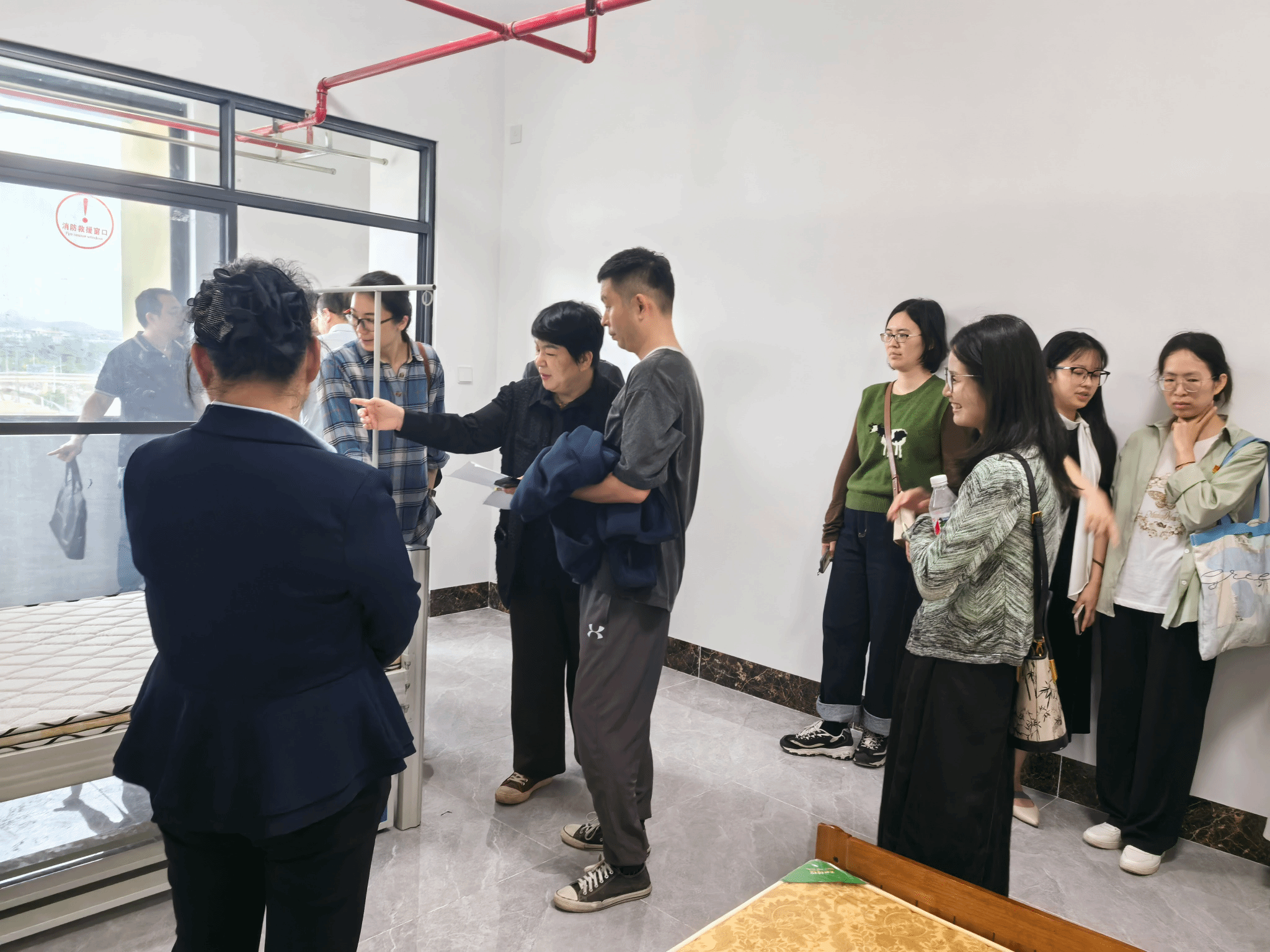 活动中,党员们率先走进宿舍改造施工现场,通过听讲解、看展板、访样板间与施工区,全面了解建设规划、施工质量及工期安排。围绕样板间床位布局、功能设计等细节,结合育人需求与学生体验提出优化建议,推动宿舍改造更贴合学生生活学习实际。